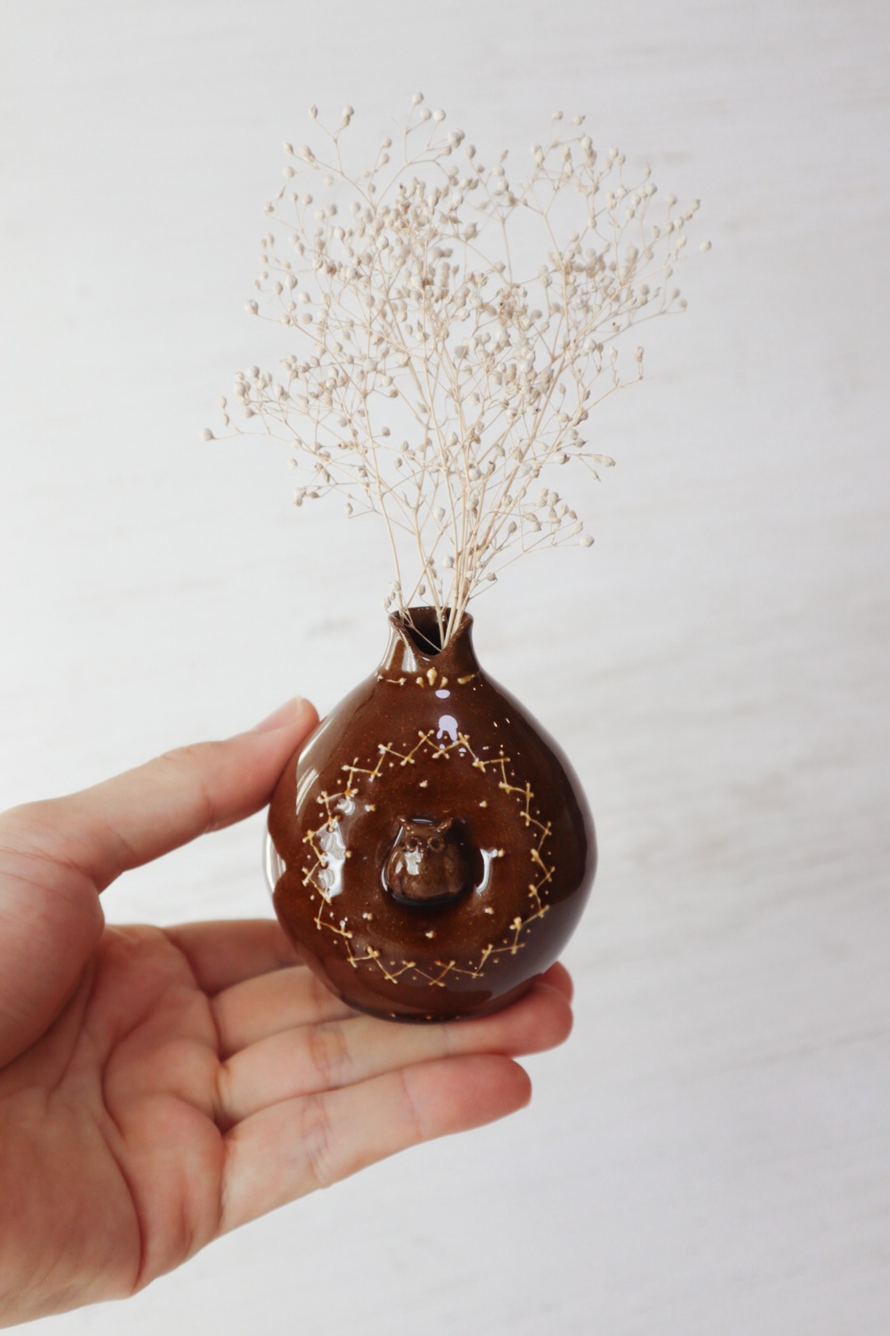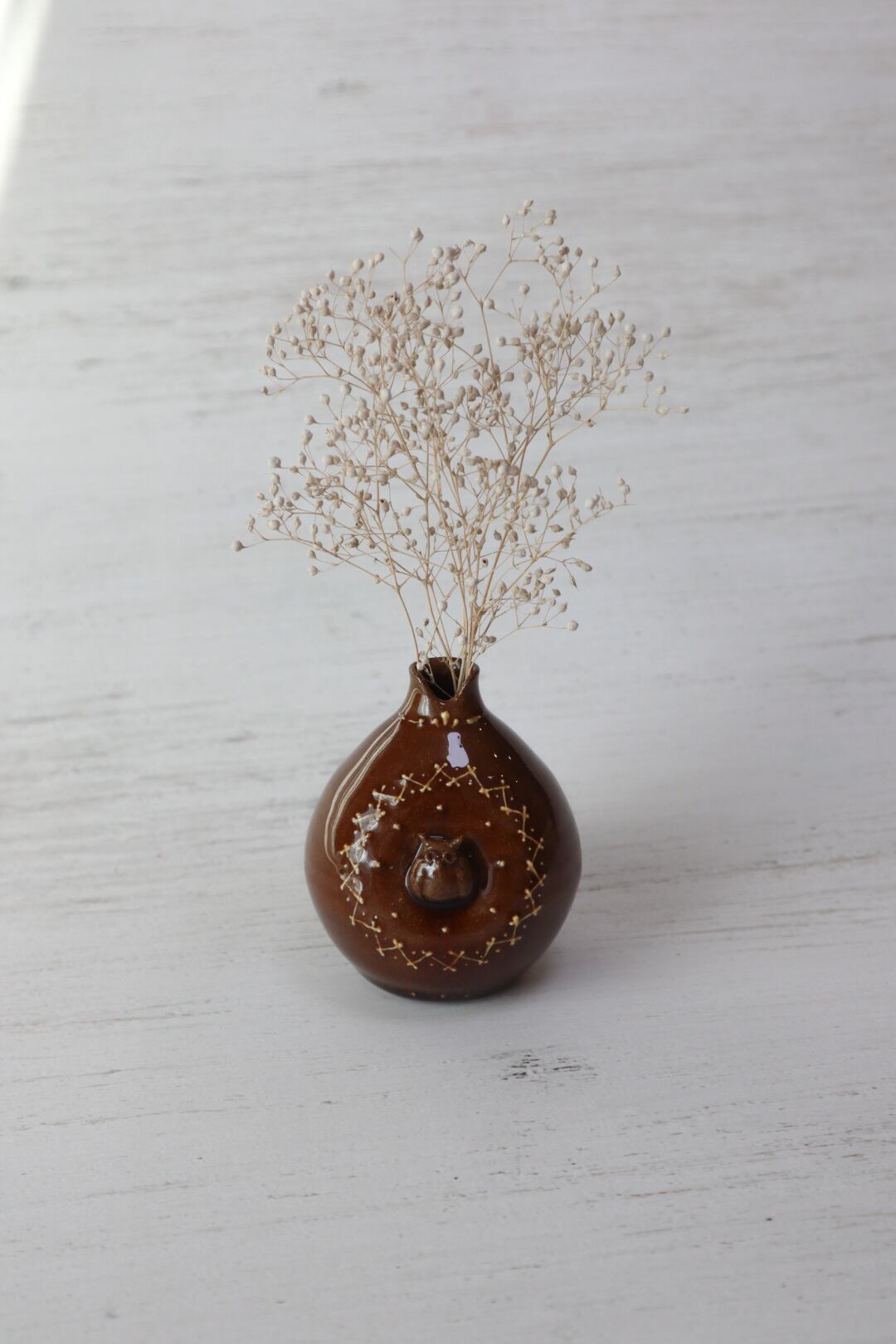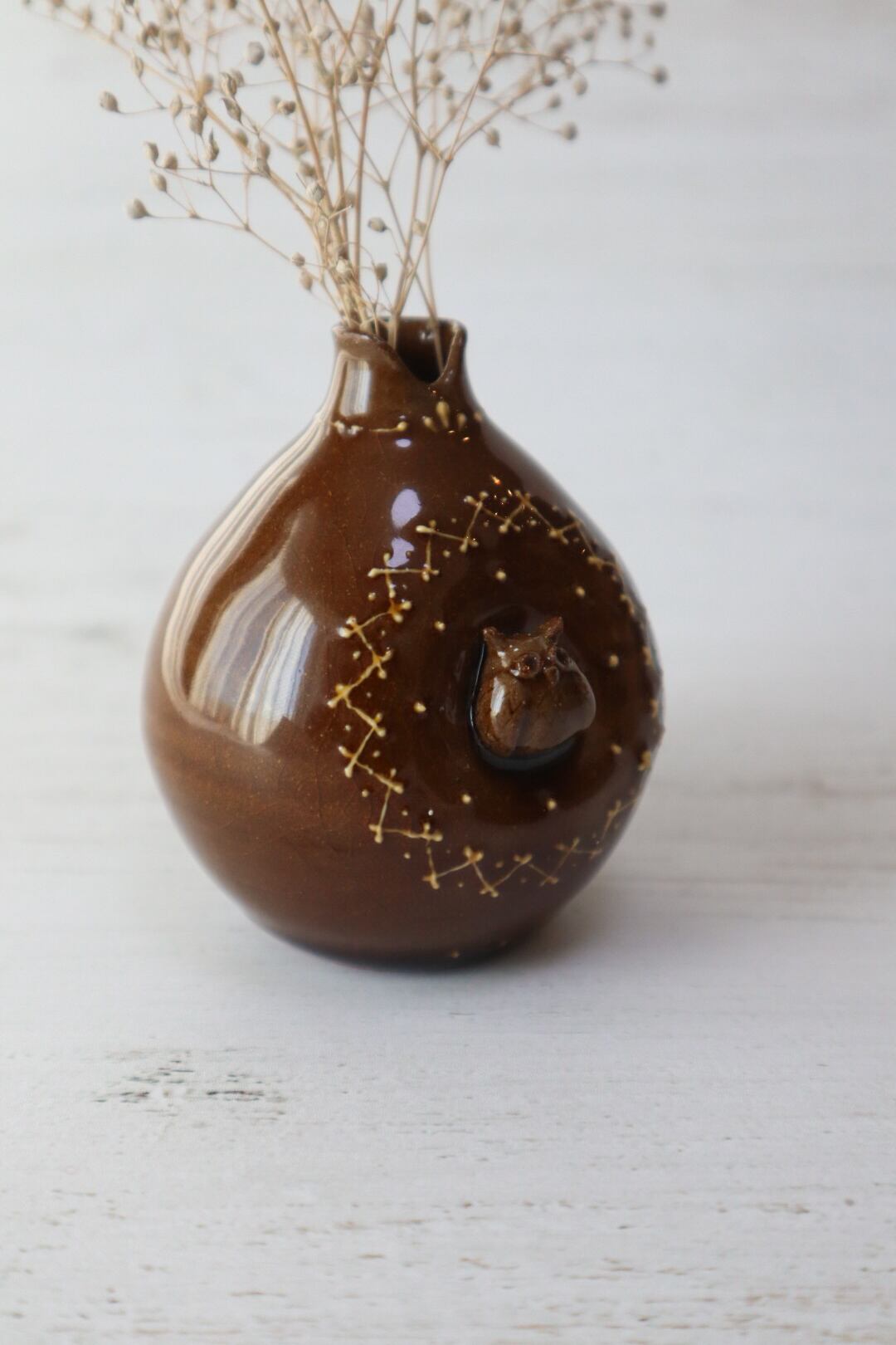 ミミズクの周りには北欧風ステッチ柄のイッチンを施し、飴色の釉薬で焼き上げ、温もりのある雰囲気に仕上げました。